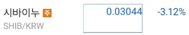 3월2일 오전 10시46분 기준 가상화폐 거래소 업비트에서는 시바이누 코인은 전일가 대비 16.85%오른 0.02770원에 거래됐었고 오늘 3월3일 오후 7시20분 업비트에서는 전일대비 -2.74% 하락한 0.03044에 거래되고 있습니다.