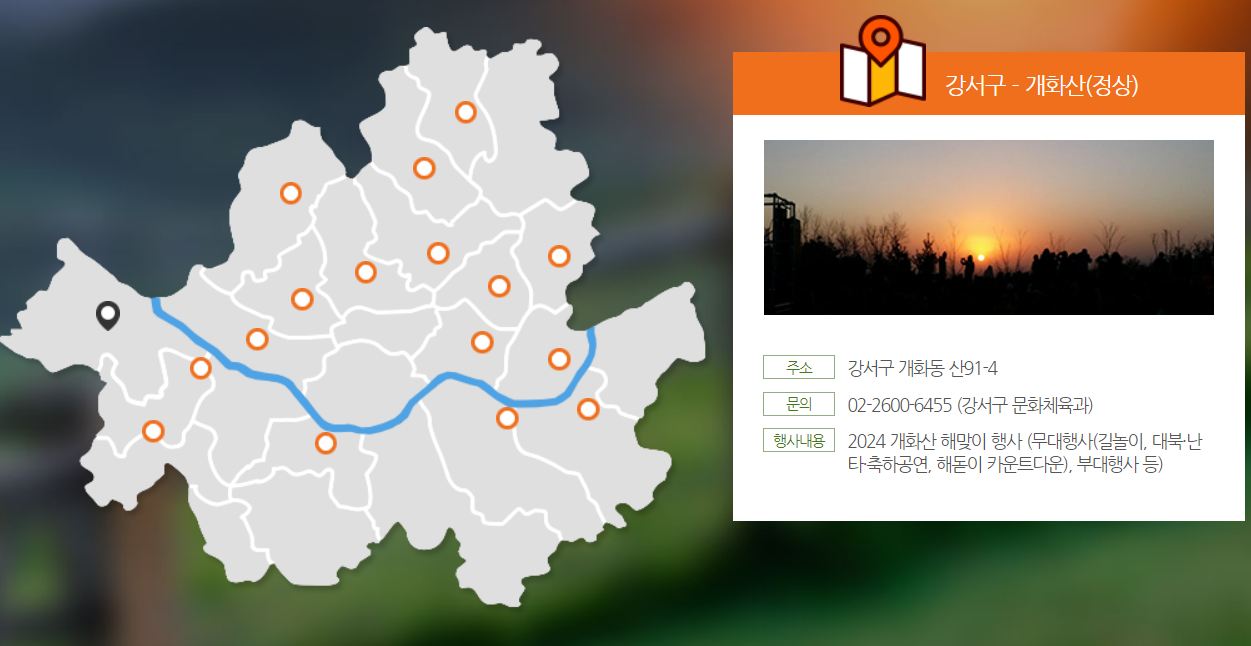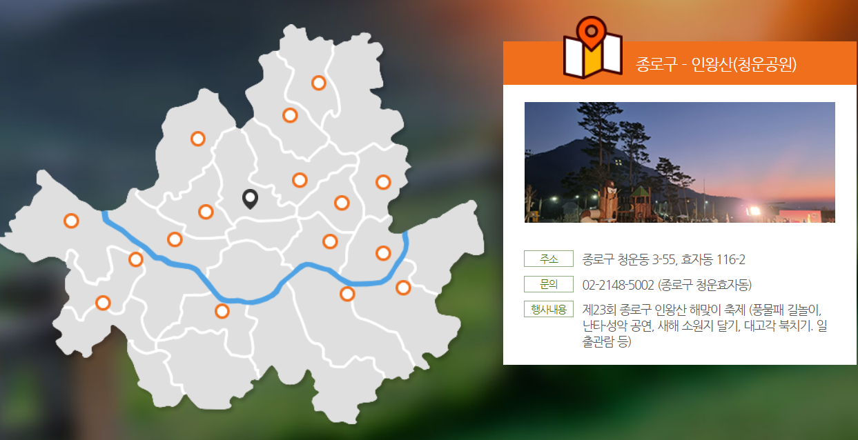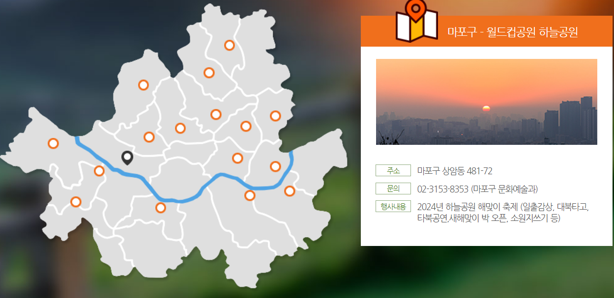 - 해맞이 행사는 장소별 시작 시간이 모두 다르기 때문에 해당 구청 홈페이지 또는 전화 문의를 통해 자세한 사항을 미리 확인 할 것