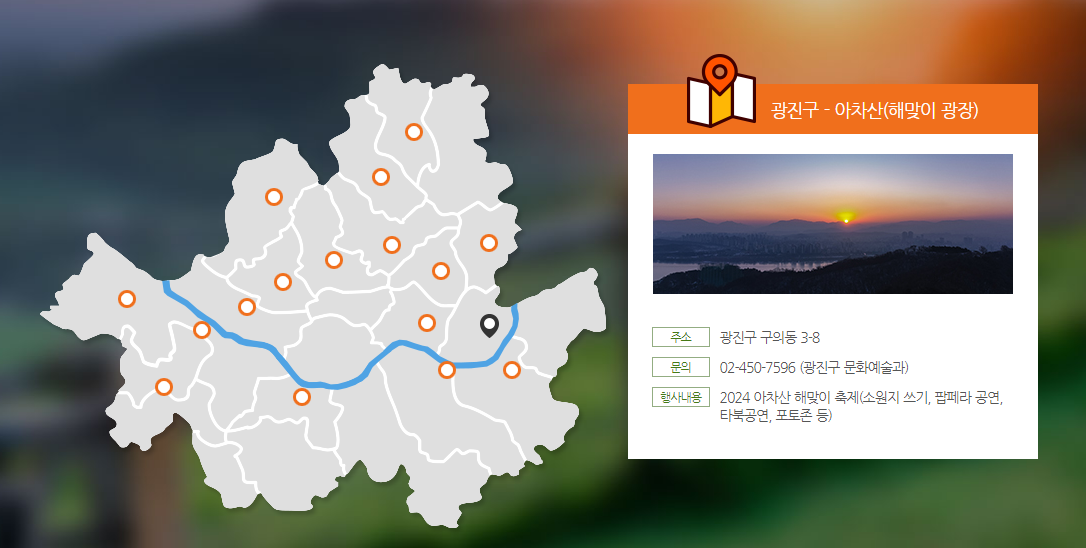 2024년 아차산 해맞이 축제가 열립니다. 축제에서는 소원지 쓰기, 팝페라 공연, 타북공연, 포토존 등 많은 행사와 볼거리들이 마련돼 있습니다.