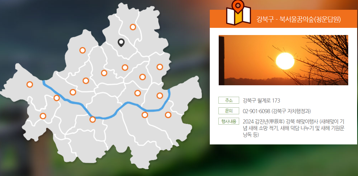 2024년 갑진년 강북 해맞이 행사가 이곳에서 열릴 예정입니다. 행사에서는 새해맞이 기념 새해 소망적기, 새해 덕담 나누기 및 새해 기원문 낭독 등의 행사가 예정돼 있습니다.