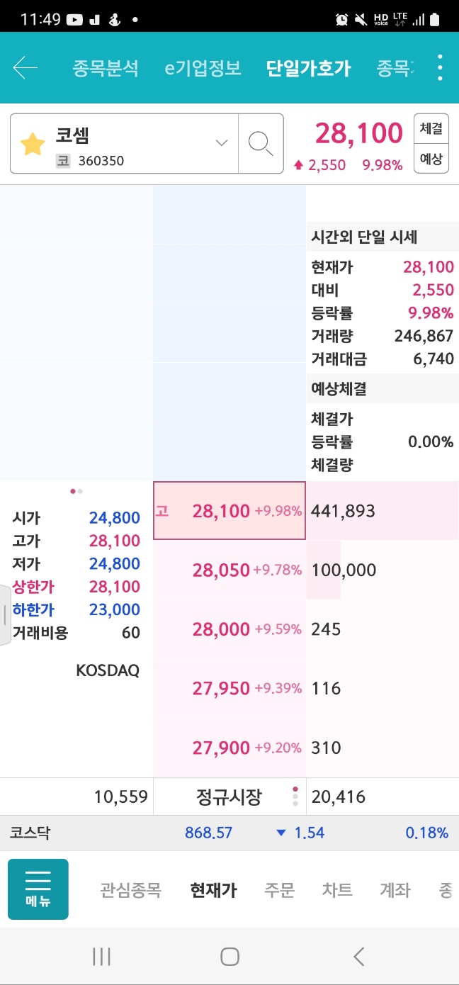 물론 월요일에는 고점 대비 50% 하락을 했기때문에 기술적인 반등이 예상되고 실제로도 이날 코셈은 단일가거래에서 시간외 상을 기록했습니다. 종가는 28100원이었습니다.